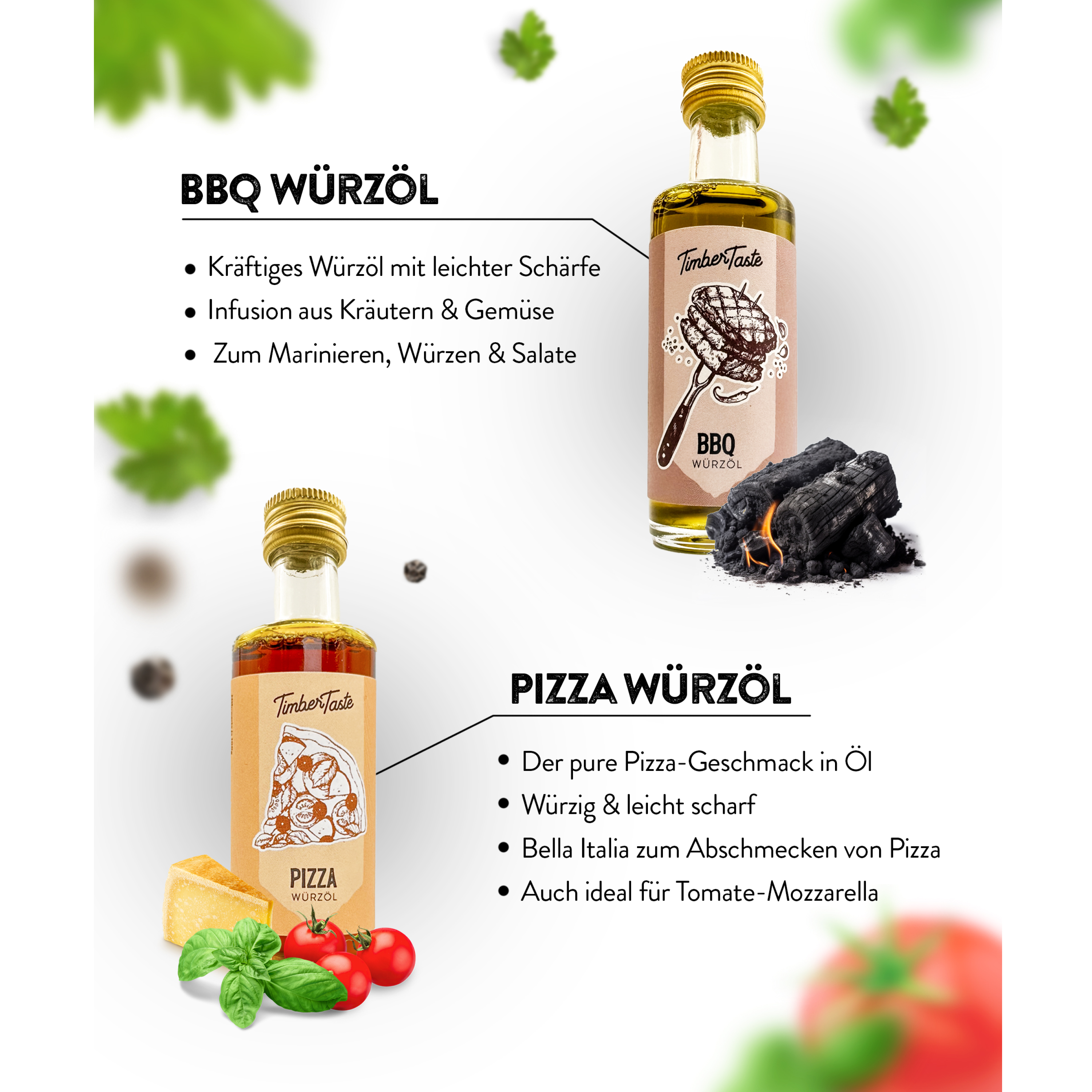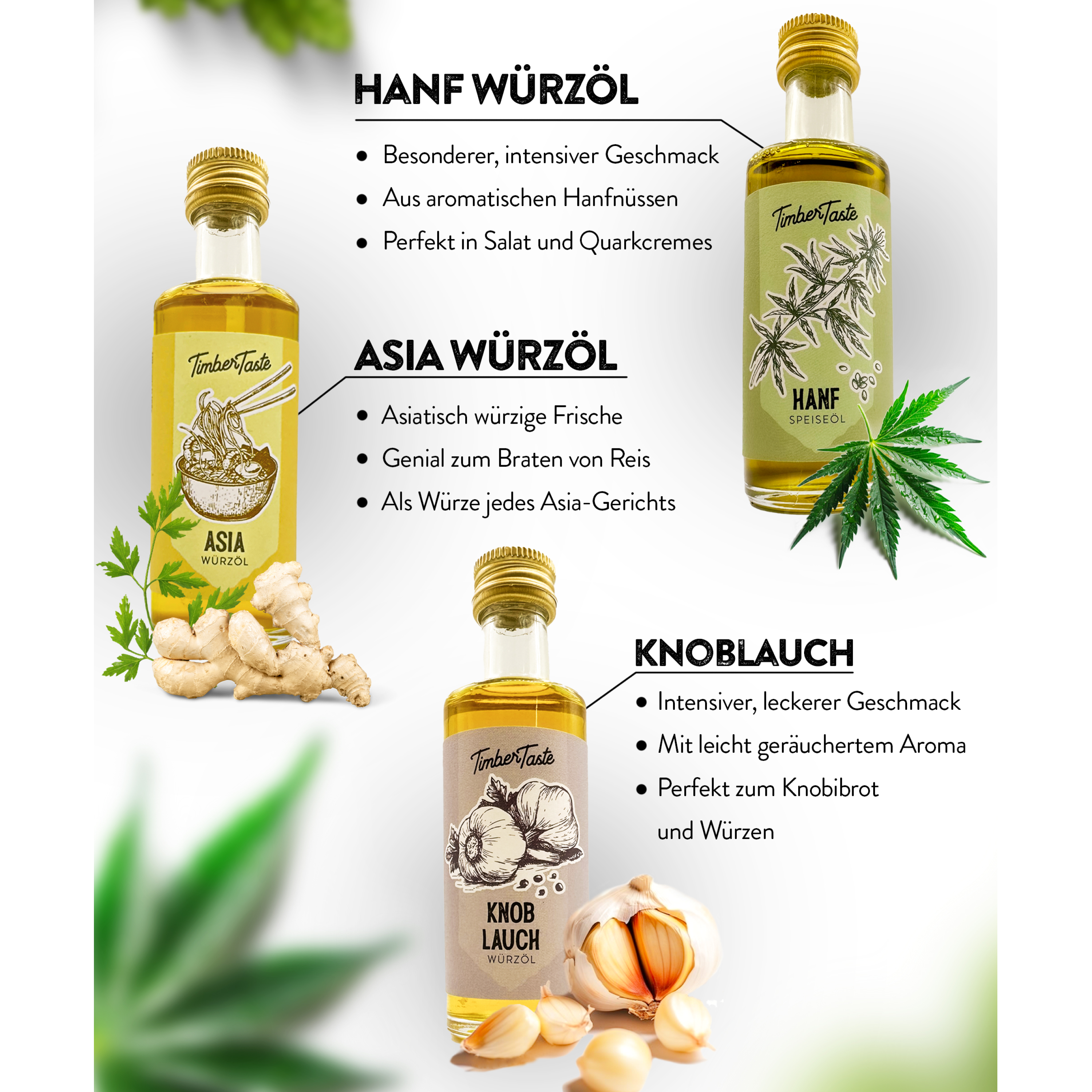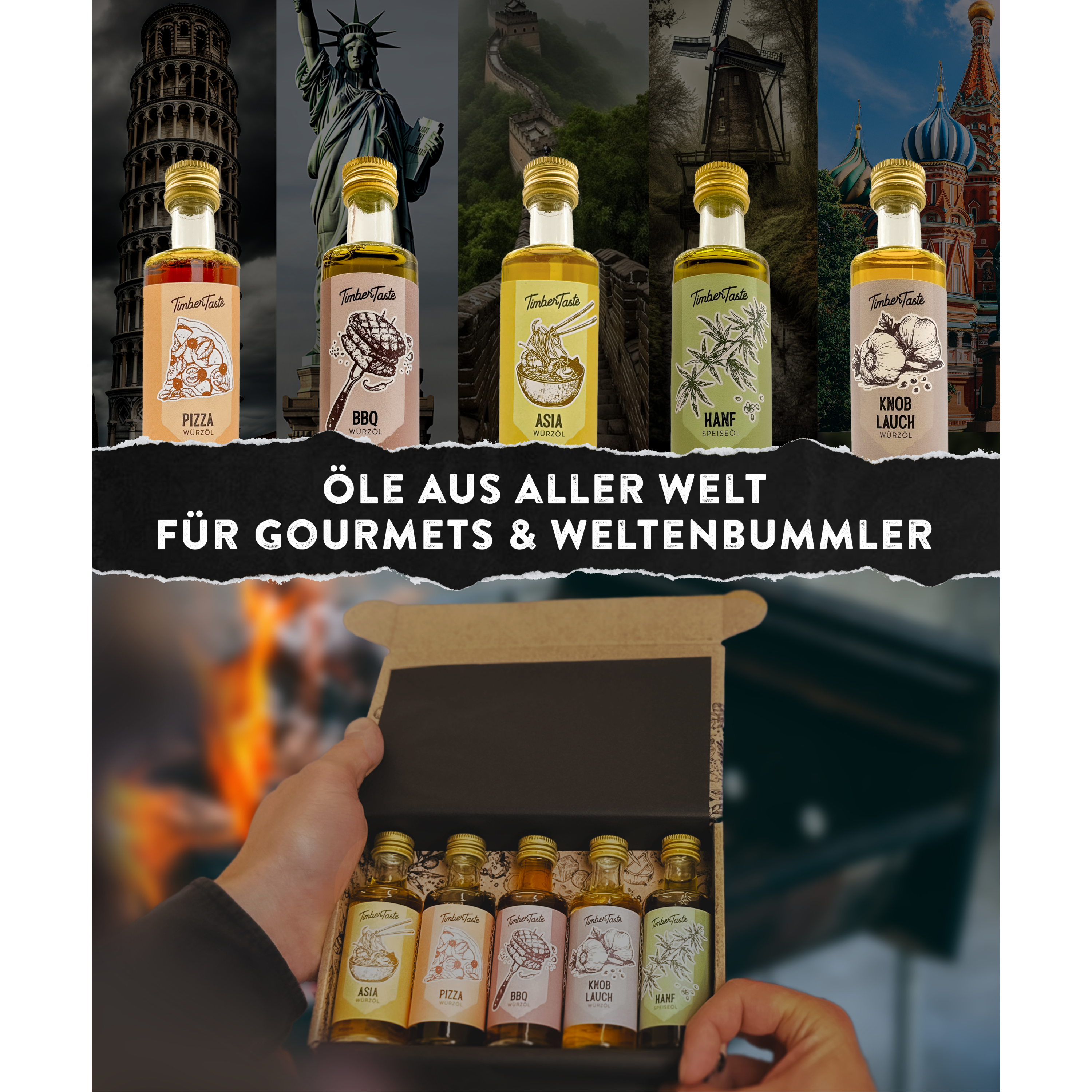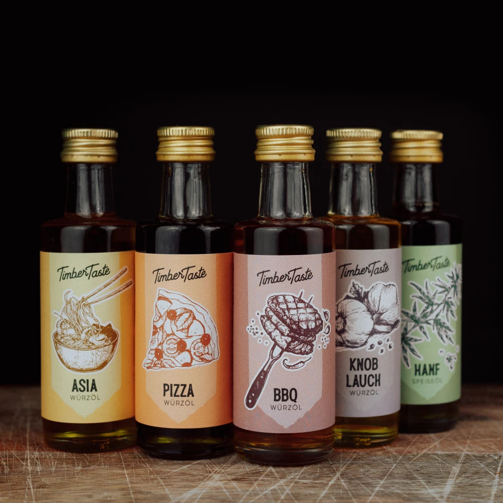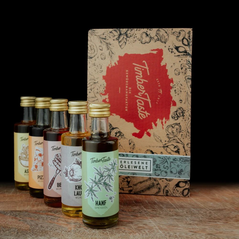 Nichts ergänzt ein Gericht besser wie ein Schuss aromatisches Öl. Doch wir von Timber Taste wollen mehr – mehr Abwechslung, mehr Farbe und vor Allem: mehr Geschmack! Unser Öl Set bietet Dir eine exklusive Auswahl beliebter, perfekt aufeinander abgestimmter Öle.