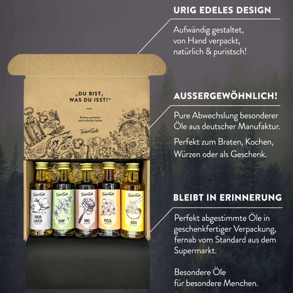 Timber Taste - Perfektes Geschenk für Liebhaber des feinen Geschmacks: Vorbei sind die Zeiten der langen Suche nach dem perfekten Geschenk für Kochliebhabern und Gourmets. Erlesene Öle aus deutscher Manufaktur, geschenkfertig verpackt und so vielfältig, wie Geschmack nur sein kann.