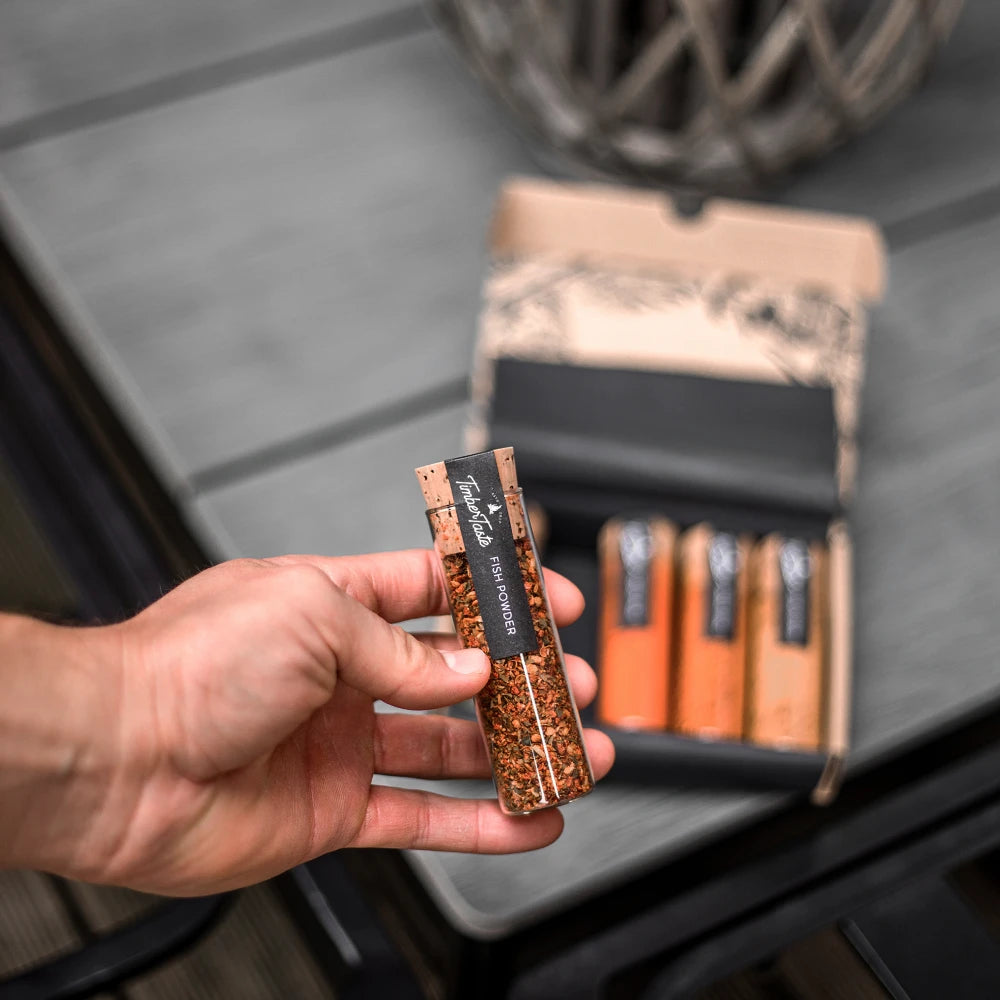 33g FISH POWDER (Gewürze (Paprika, Ancho-Chili, Zwiebel, Koriander, Knoblauch, SENFKÖRNER, Pfeffer, geräucherter Paprika, Kümmel, Chilies, Thymian, Majoran, Kreuzkümmel, Piment, Liebstöckel, Basilikum, Lorbeer, Rosmarin, Wacholderbeeren, Oregano, Nelken), Meersalz, Rauchsalz. Salzgehalt: 34%. Kann Spuren von SESAM und SELLERIE enthalten.)